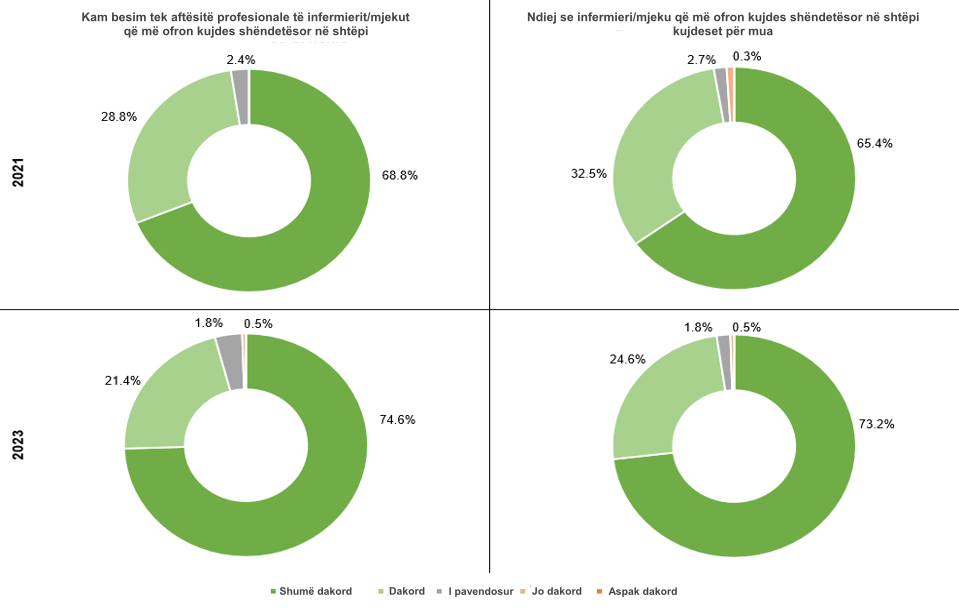 Sipas Vlerësimit të Cilësisë së Jetës dhe nevojave për Kujdes Shëndetësor në Banesë në Fier dhe Dibër”, nga viti 2021 në 2023 ka një rritje të ndjeshme si të pacientëve që kanë besim tek aftësitë profesionale të personelit shëndetësor ashtu edhe në cilësinë e përkujdesjes që ata ndiejnë nga shërbimi në banesë.